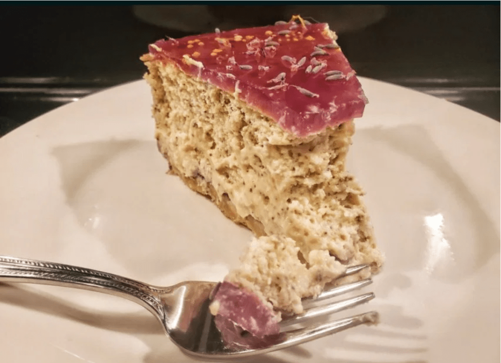 9. Once set and before serving decorate the top of the cheesecake with fresh lavender petals and bee pollen. Serve.
