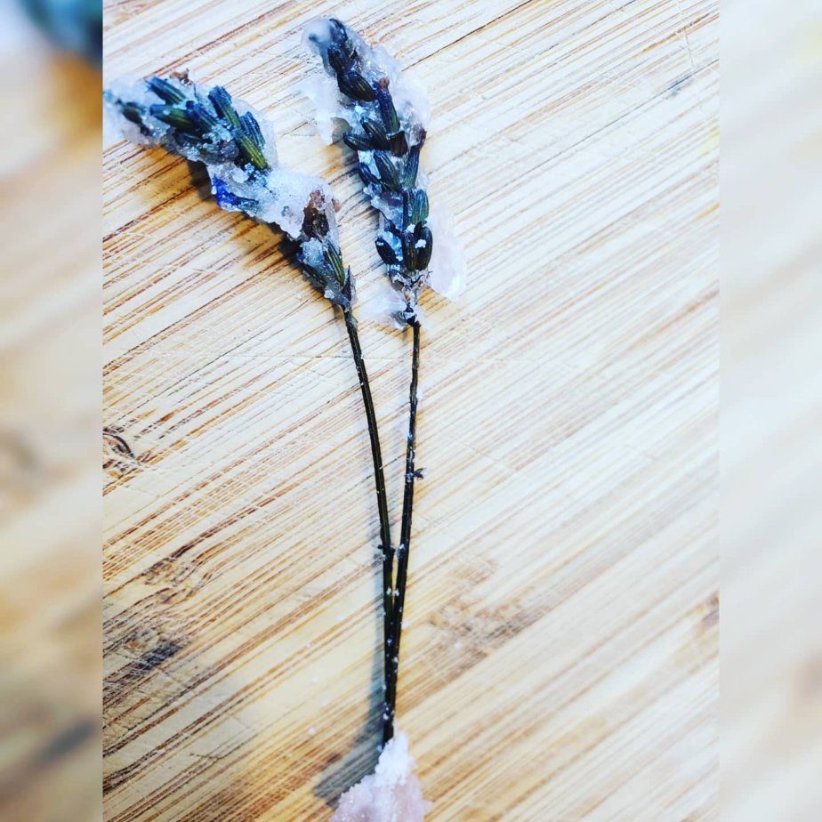 I fried a couple of sprigs of lavender and covered the sprigs with a reduced simple syrup I created with swerve and monk fruit sweetener. It created a nice crystallized effect.