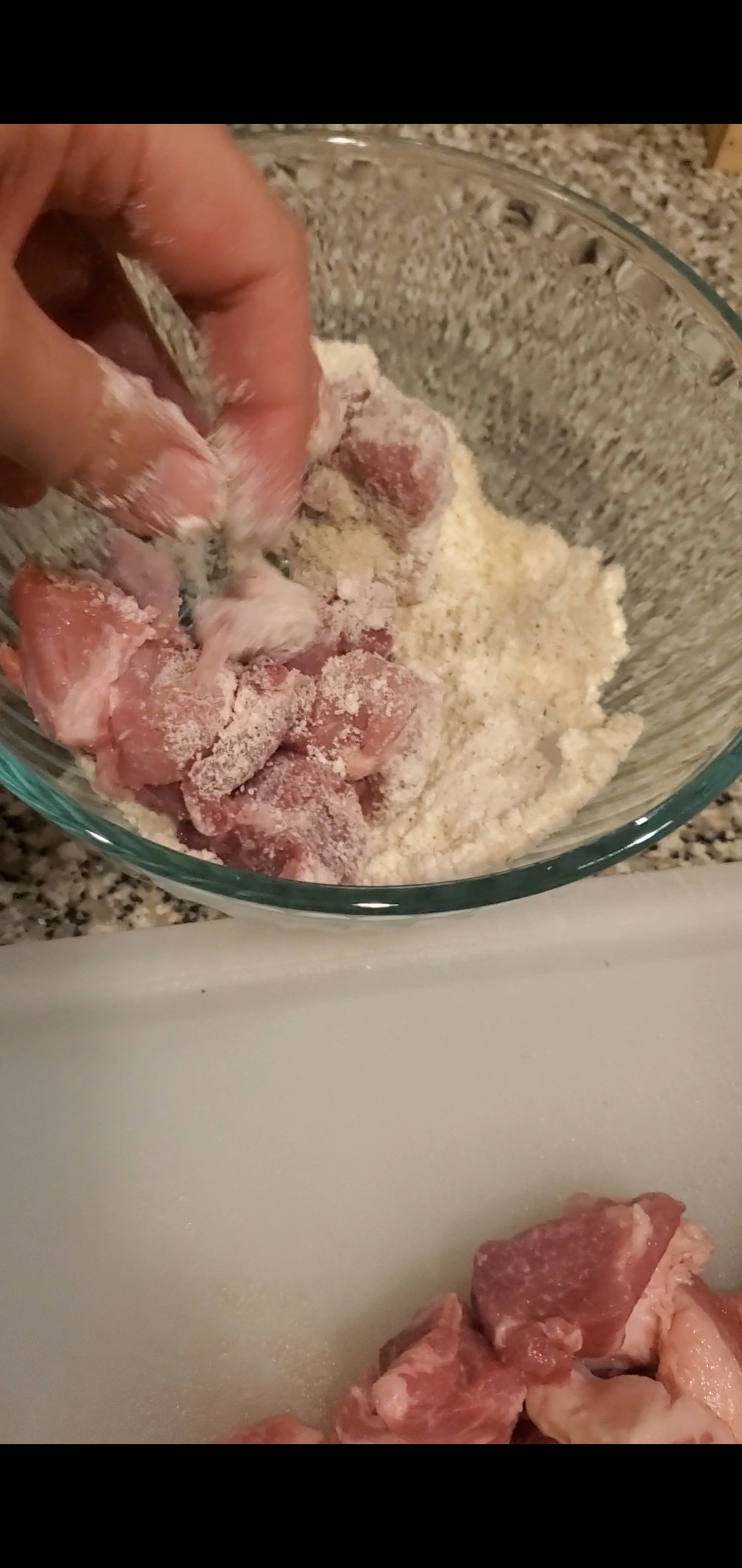 - Dredge pork on flour until evenly coated. Can also add pork and dredging flour to bag, close and shake if that’s easier for you.